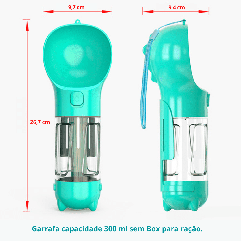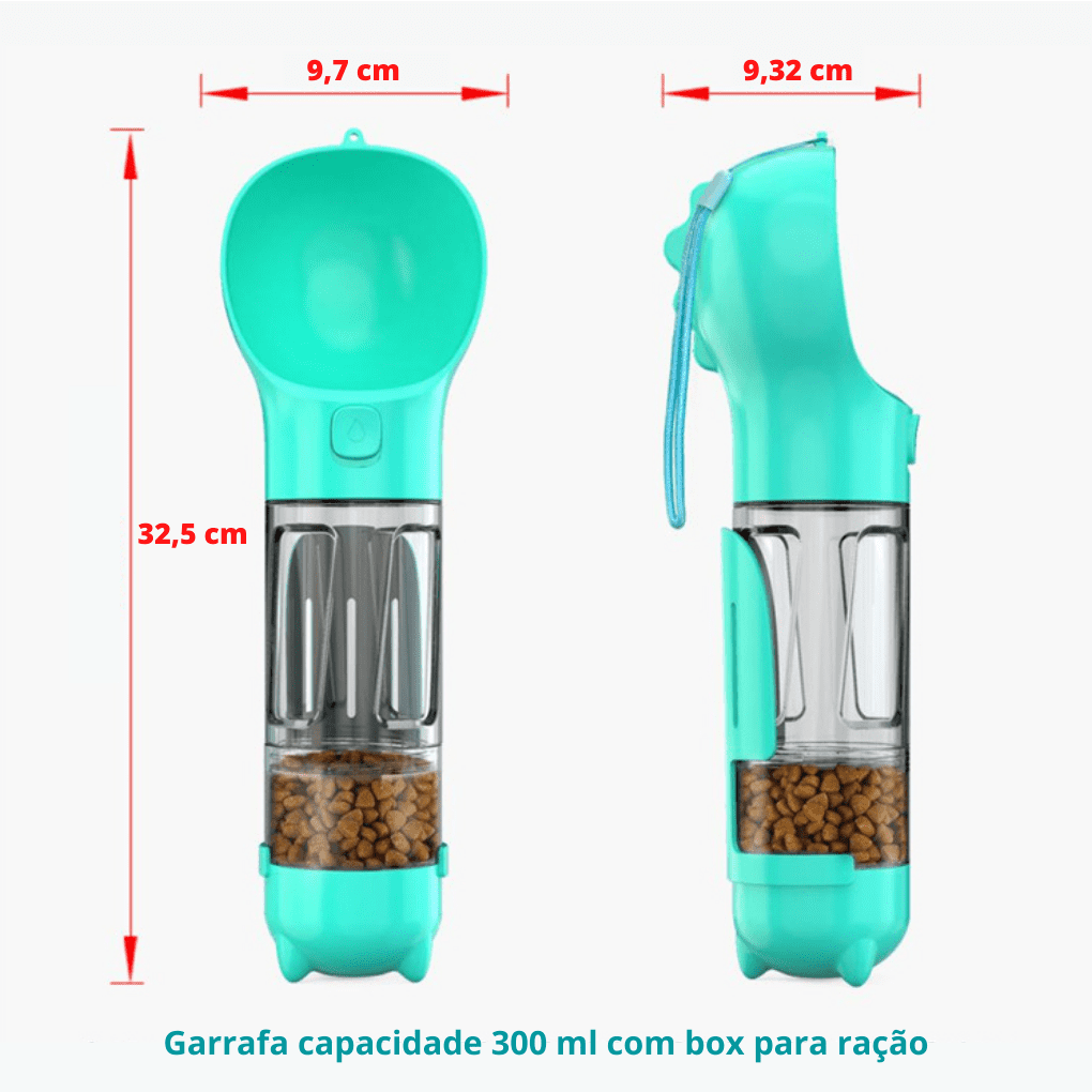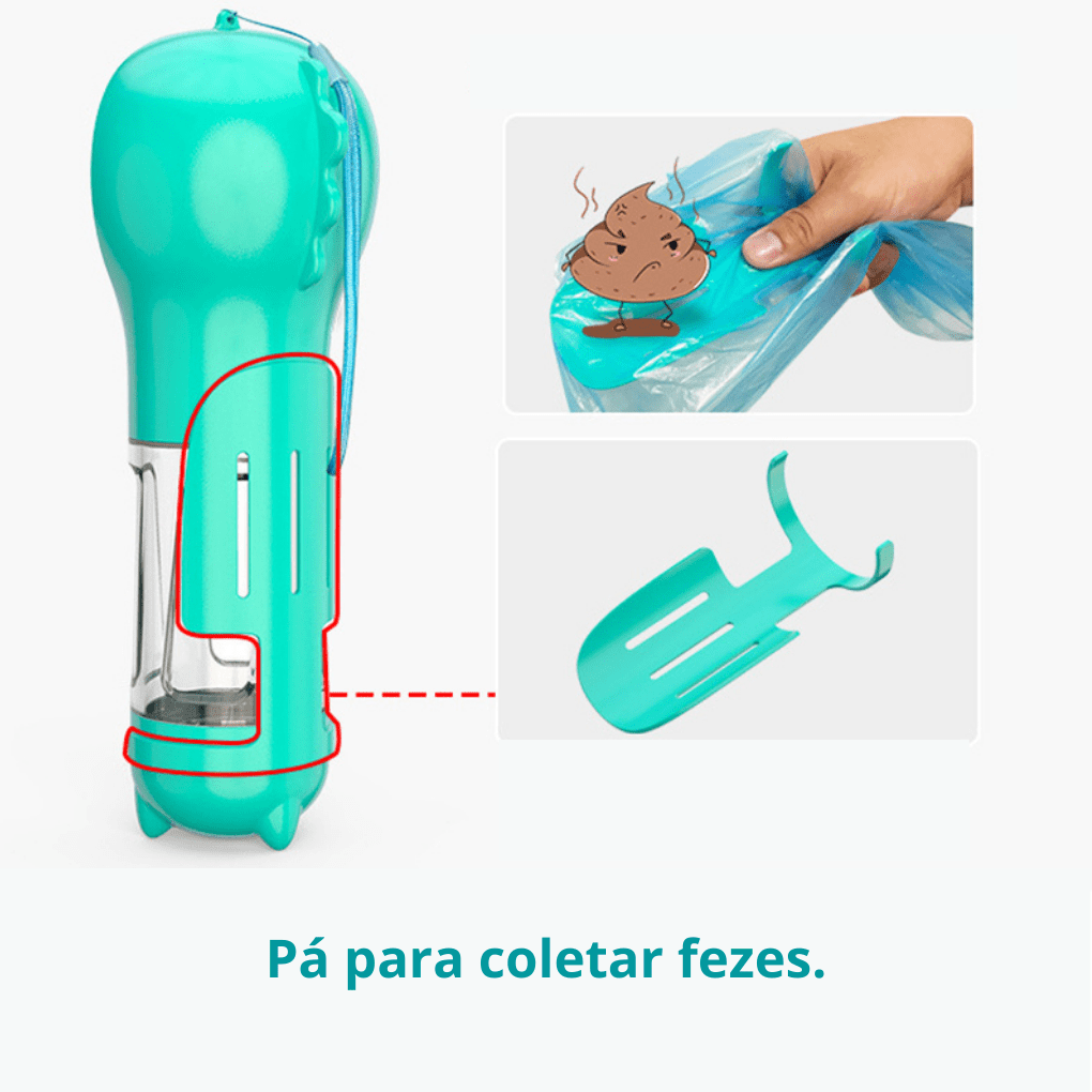 Com seu exclusivo sistema de Multifunção, além de ter água para o seu amiguinho sempre a mão, a garrafa conta com um recipiente para armazenamento de sacos plásticos e uma pazinha para recolhimento das fezes de seu amiguinho em qualquer lugar, de forma fácil e higiênica.